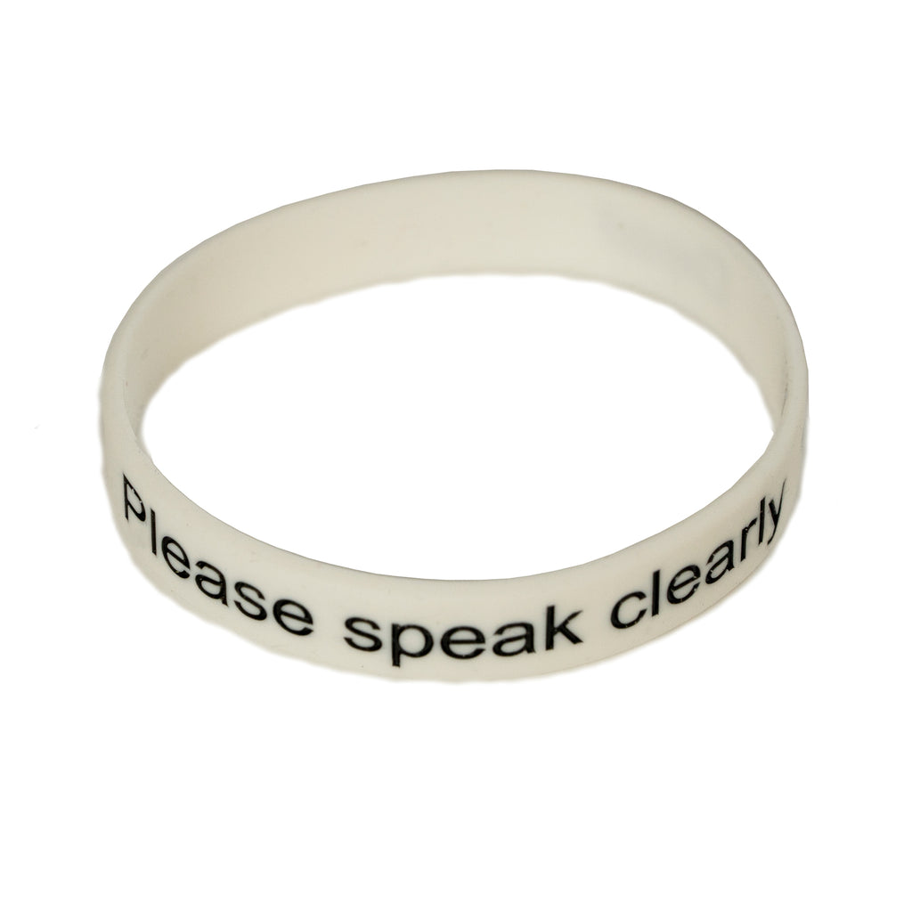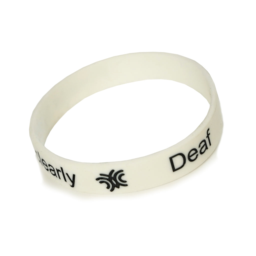 The wristband in white / light grey in colour and features black embossed writing with the message 'DEAF - please speak clearly' as well as the Hearing Link logo.
