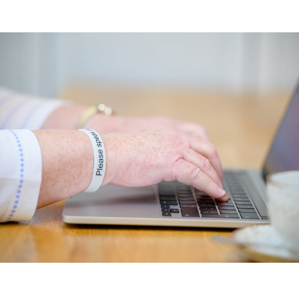 The 'DEAF - please speak clearly' wristband is a discreet way to alert others about your hearing needs. It tucks away under your sleeve when you don't want it to be seen and can be made visible when the situation / circumstance requires it.