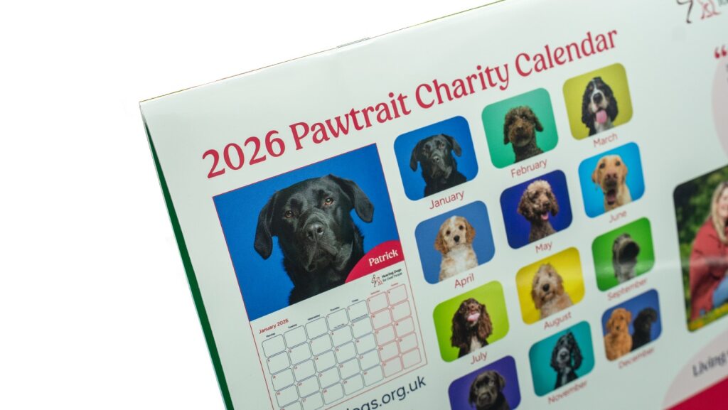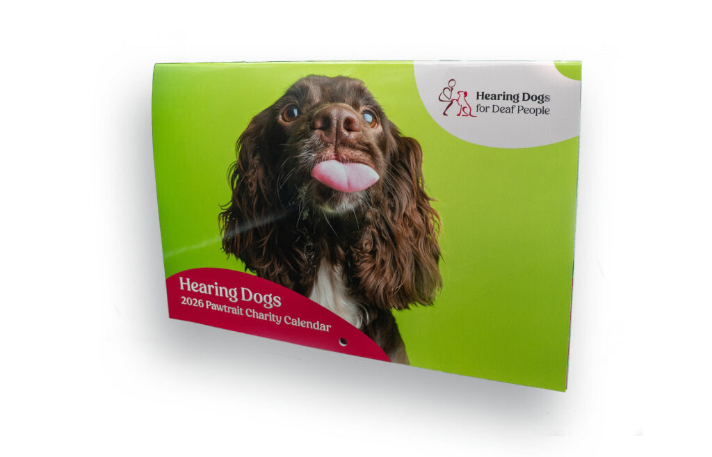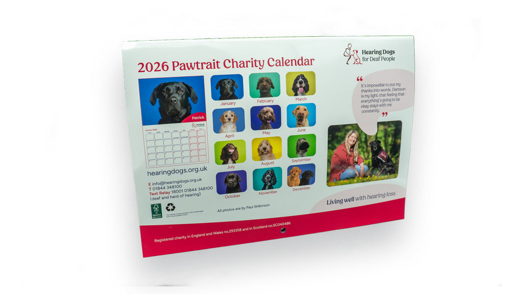 New for 2026 - the Hearing Dogs Pawtraits Calendar! The calendar folds out to A3 size with a hole to hang it up. Enjoy a cheerful dog each month, and with an A4 page with squares with plenty of space to add birthdays, important appointments, and reminders.