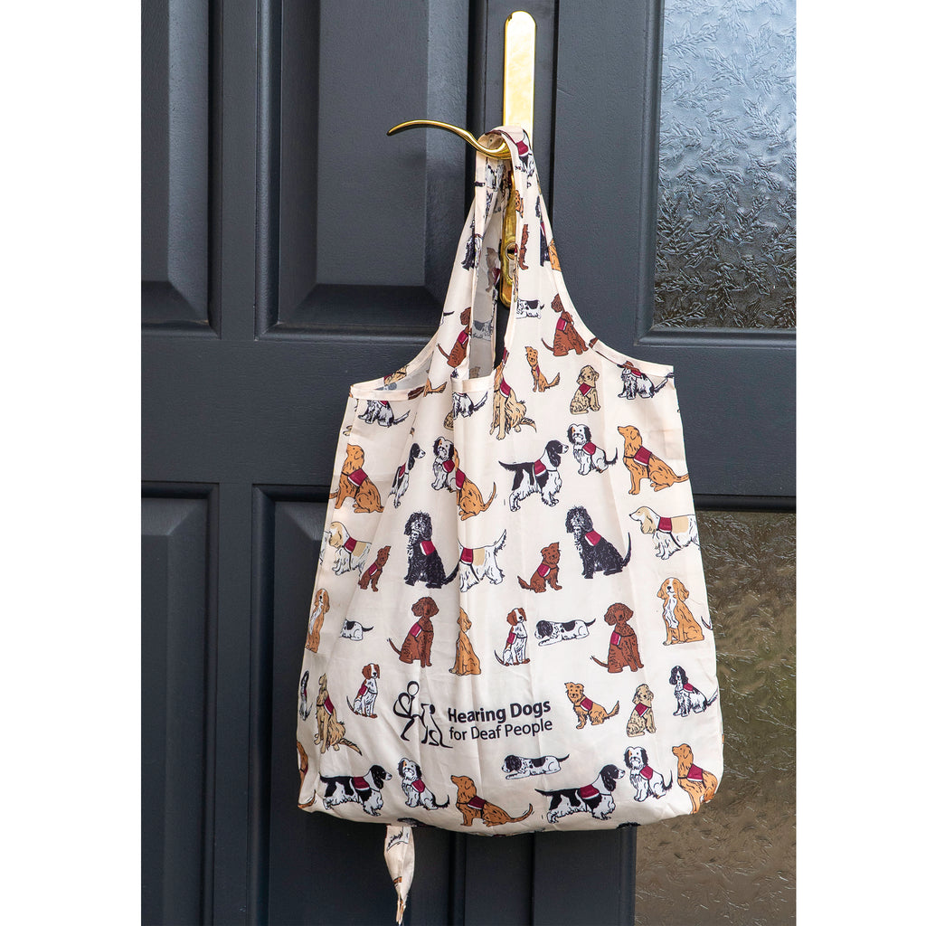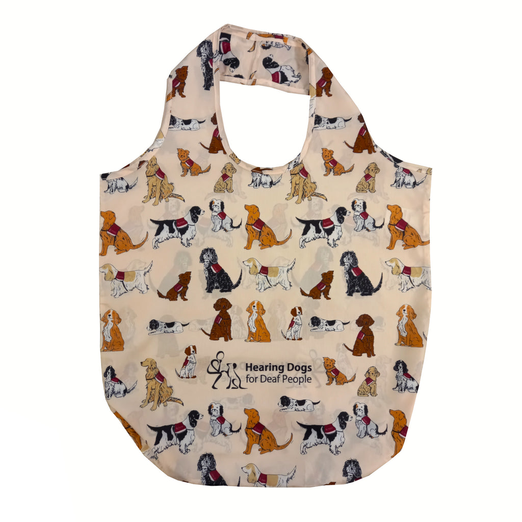 Handy cream fold away packable bag designed especially for Hearing Dogs. Design features illustrated dogs wearing the official hearing dog jacket and including the Hearing Dog logo. Great for everyday shopping trips simply unclip the popper and unroll the bag when needed. Takes up minimal space in a handbag or pocket. Made from 100% polyester.
