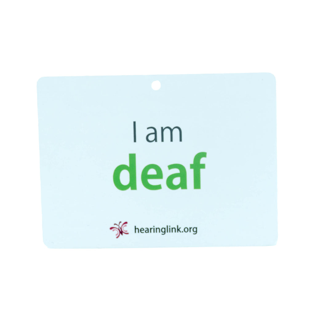 The 'I am deaf' card is designed for use with its companion lanyard. This card is a very visible way for people who are deaf/Deaf to communicate their needs assertively.