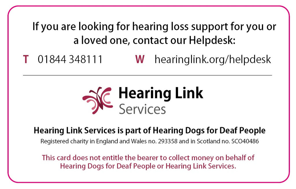 Reverse side message: Hearing Link Services logo. Helpdesk contact information. Charity information.