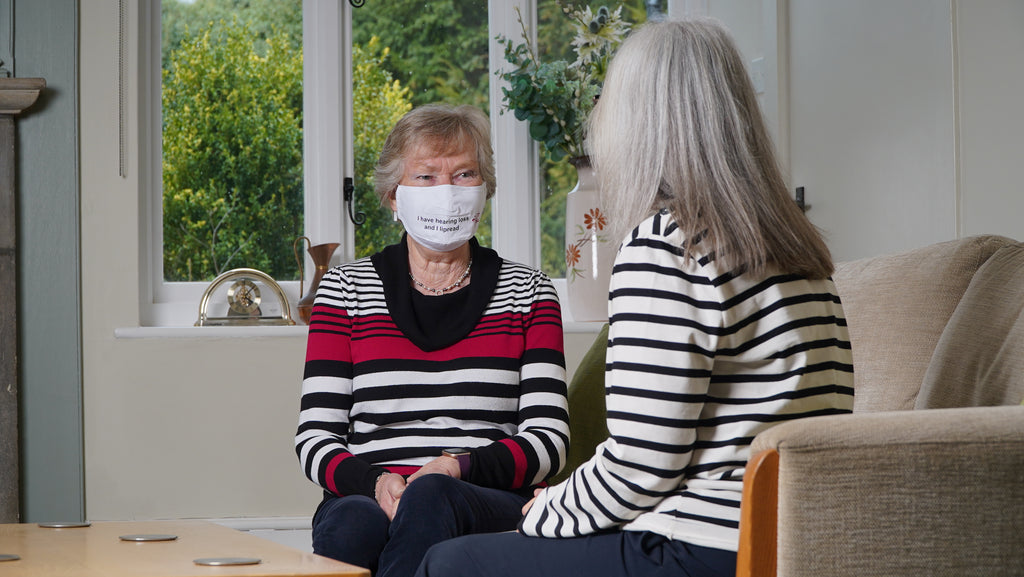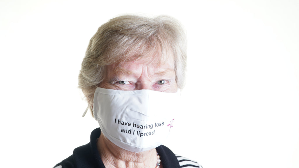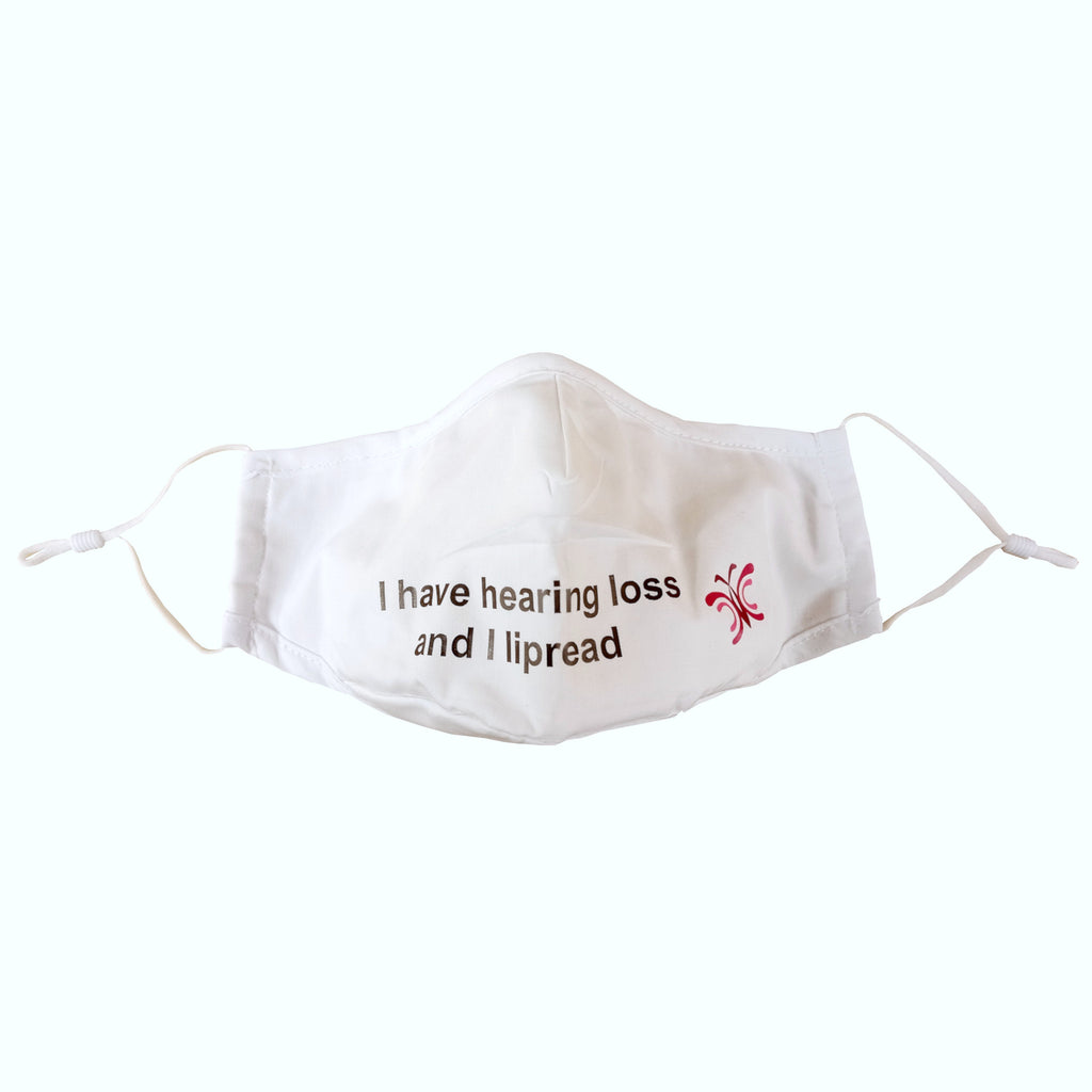 Re-useable fabric face covering with adjustable straps featuring the message "I have hearing loss and I lipread" and Hearing Link Services butterfly logo.