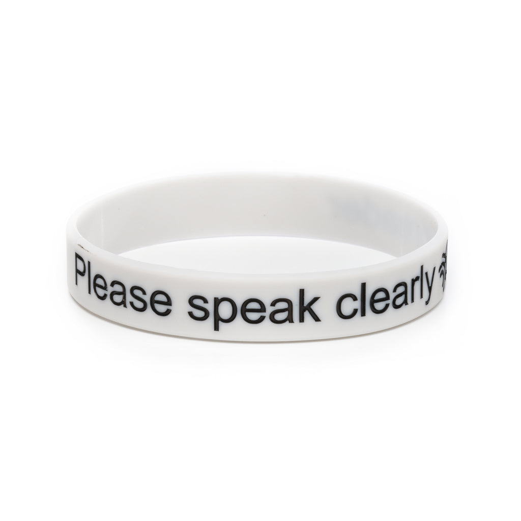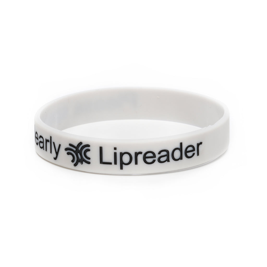 The wristband in white / light grey in colour and features black embossed writing with the message 'Lipreader - please speak clearly' as well as the Hearing Link logo.