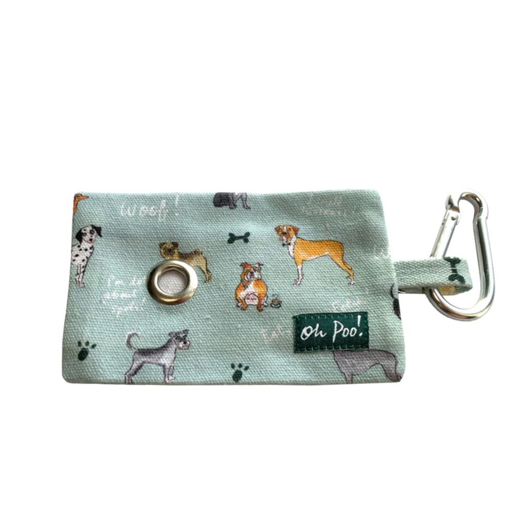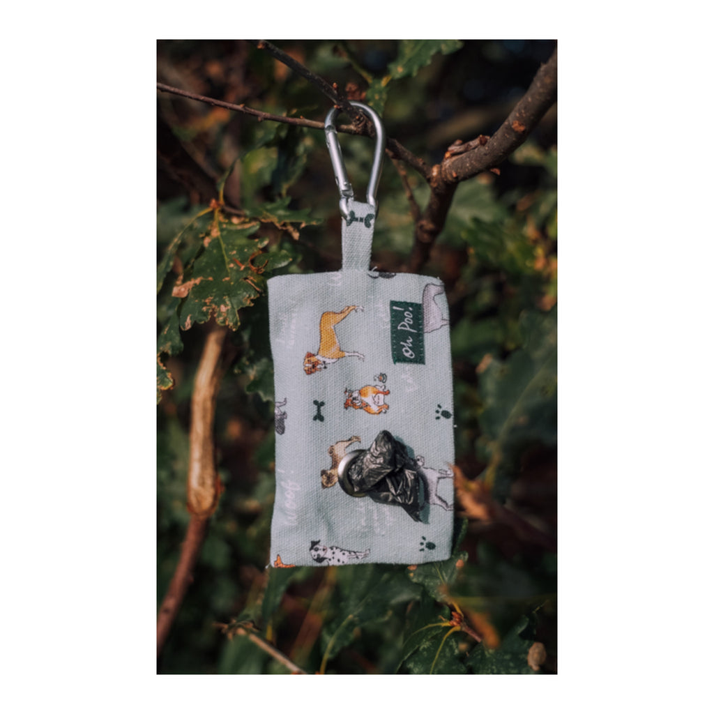 A lightweight, cotton fabric holder for carrying poop bags (poop bags not included). It comes with a clip for attachment to a belt or bag and a handy metal porthole for easy access to a bag which can be pulled through. The holder has a lovely light blue background with a colourful, illustrated dog pattern. Featuring lots of different canine drawings.