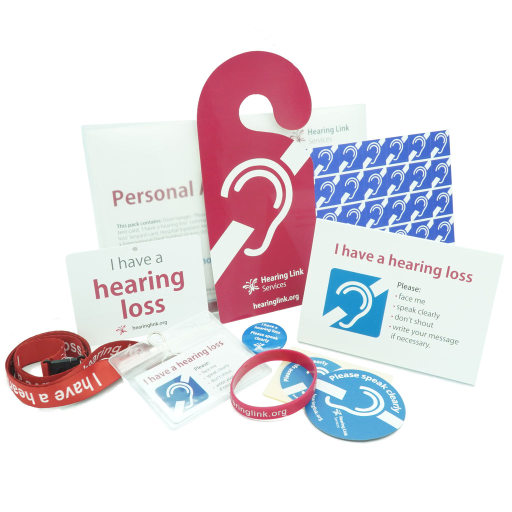Hearing loss packs include: 1 x Door hanger. 1 x 'Please speak clearly' magnetic sign. 1 x 5 'Please speak clearly' stickers. 1 x 'I have hearing loss' tent card. 1 x choice of communication lanyard. 1 x 'I have a hearing loss' communication card. 1 x 'I have a hearing loss' lanyard card, 1 x 'I have a hearing loss wristband (burgundy). 1 x 40 medical record stickers (15mm). 1 x 40 medical record stickers (25mm) and 1 x choice of pin badge (alternatives: 'I have hearing loss' or 'Please bear with me' pin badge.